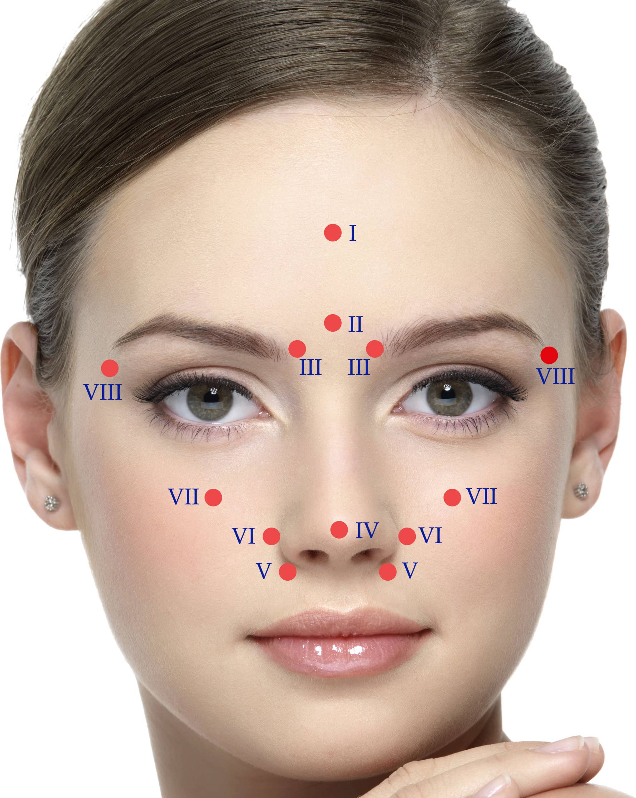 VII – Массаж пазух. Точки расположены на скулах ниже уровня глаз (по линии зрачков).